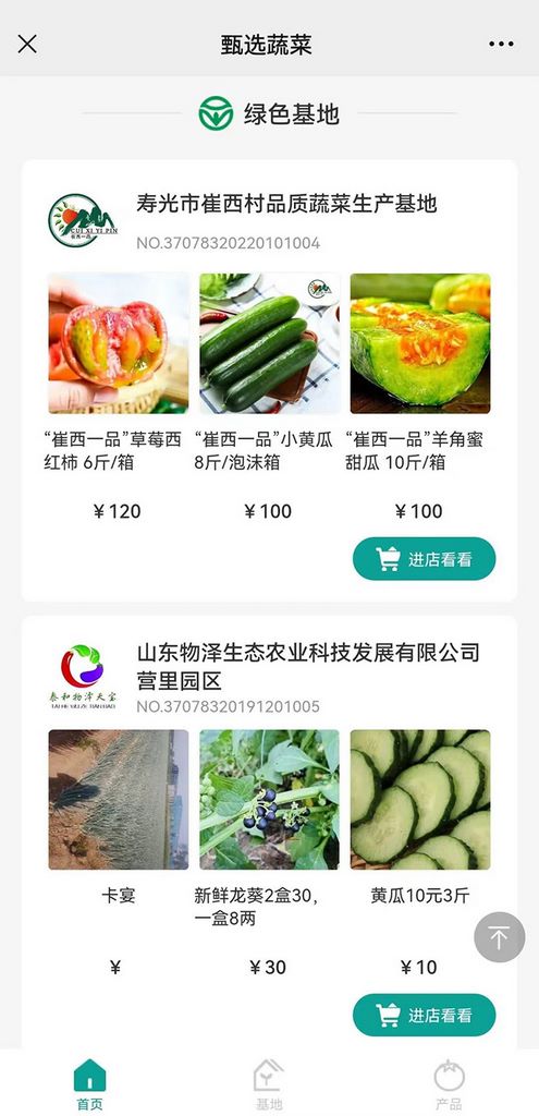 点击每个基地右下方的“进店看看”,即可进入该基地的销售小程序,在线下单。