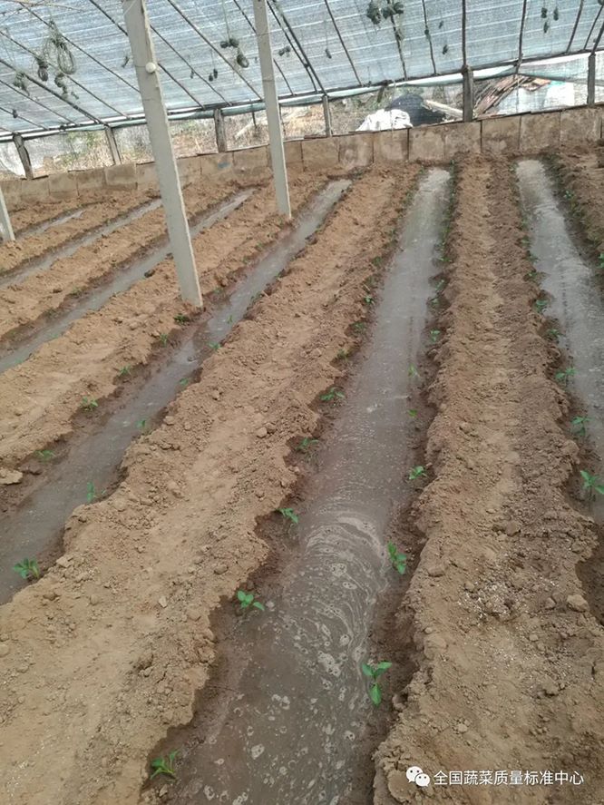苗子定植完毕后,定植水常规做法是伴随着苗子定植进行浇水,该水的主要目的在于使育苗基质与土壤尽可能地融合,增加土壤湿度和空气湿度,避免新根未生、根系吸水不足造成秧苗萎蔫或死亡。该水要求水量大、要浇透。早春茬种植时可“先浇水,后定植”。在大体了解来苗时间以后,提前3天-4天浇沟洇垄。