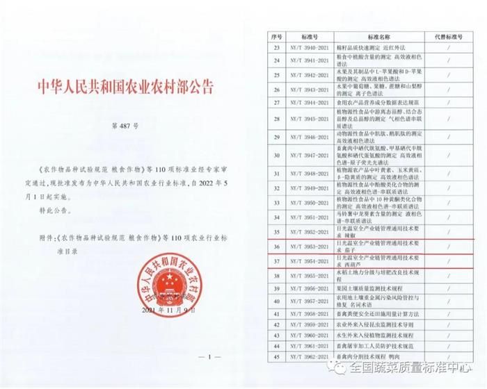 近日,农业农村部发布第487号公告,批准了110项农业行业标准。其中,由全国蔬菜质量标准中心主持起草的行业标准NY/T 3952-2021《日光温室全产业链管理通用技术要求 辣椒》、NY/T 3953-2021《日光温室全产业链管理通用技术要求 茄子》、NY/T 3954-2021《日光温室全产业链管理通用技术要求 西葫芦》正式发布,将于2022年5月1日起正式实施。