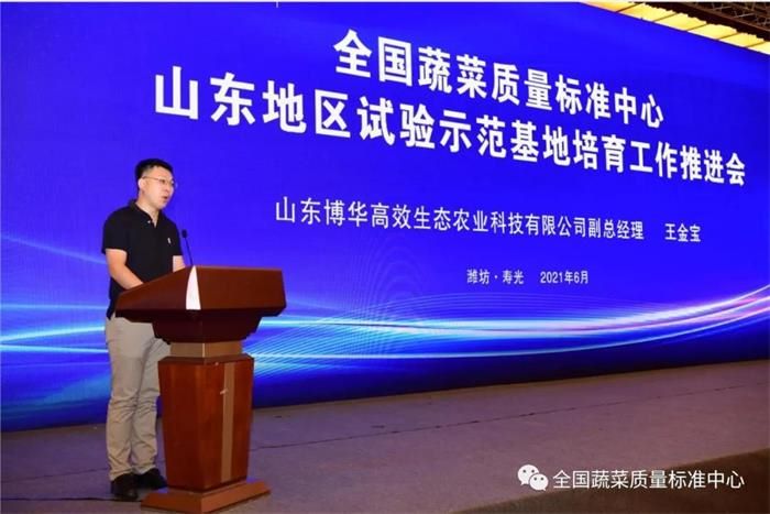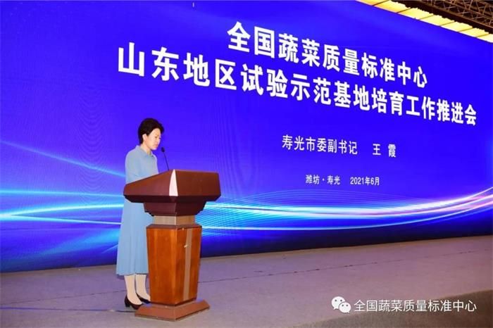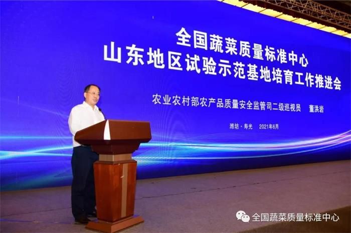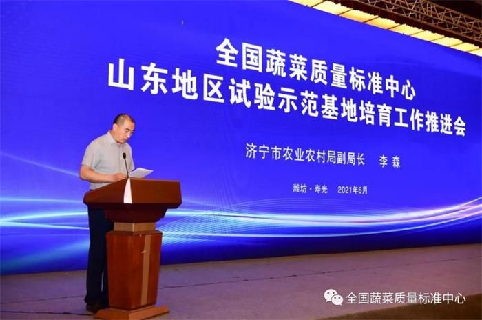 6月10日,全国蔬菜质量标准中心山东地区试验示范基地培育工作推进会议在潍坊寿光召开,会议由山东省农业农村厅主办,全国蔬菜质量标准中心承办,主要目的是认真落实中央一号文件精神,加快健全现代农业全产业链标准体系,推动新型经营主体按标生产,培育农业龙头企业标准“领跑者”,加强农业技术标准化体系建设,试验、示范、推广、应用全国蔬菜质量标准中心蔬菜全产业链标准,集成试验推广一批绿色化、优质化、标准化技术,建成一批蔬菜标准化示范基地,实现蔬菜产业标准化、优质化、品牌化发展,加快全省农业高质量发展,全面助推乡村振兴。农业农村部农产品质量安全监管司二级巡视员董洪岩、山东省农业农村厅农产品质量安全监管处处长张刚、山东省农业农村厅农产品质量安全监管处四级调研员邱庆浩、山东省农业农村厅农产品质量安全监管处二级主任科员邹晓琳、潍坊市农业农村局副局长许宝国、济宁市农业农村局副局长李森、寿光市委副书记、市长李鹏,全国蔬菜质量标准中心、山东省各地市、有关县市区农业农村局质监科负责同志,申报试验示范基地主体负责人和媒体记者朋友们参加会议。会议由寿光市委副书记王霞主持。