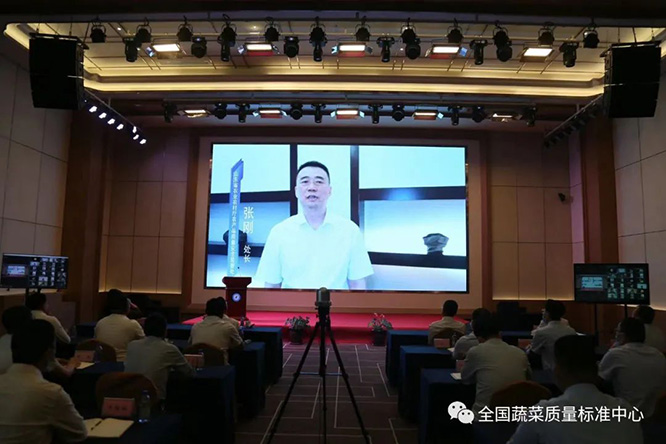 全国50家试验示范基地的主要负责人、采购负责人以及7家优质蔬菜采购企业在分会场参加了视频会议。会上,农业农村部农产品质量安全监管司二级巡视员董洪岩、山东省农业农村厅农产品质量安全监管处处长张刚视频讲话,全国蔬菜质量标准中心党组书记、主任付乐启致辞,会议由全国蔬菜质量标准中心副主任李美芹主持。