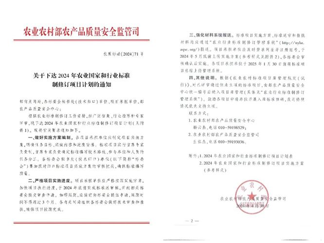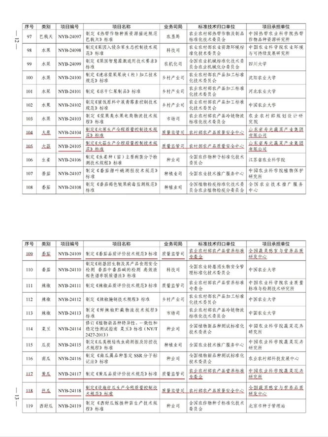 近日,农业农村部农产品质量安全监管司下达2024年农业国家和行业标准制修订项目计划。其中全国蔬菜质量标准中心牵头制定的《番茄品质评价技术规范》和《设施丝瓜生产全程质量控制技术规范》2项行业标准及参与制定的《黄瓜品质评价技术规范》、《大葱生产全程质量控制技术规范》、《大蒜生产全程质量控制技术规范》3项行业标准获立项。
