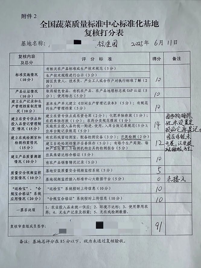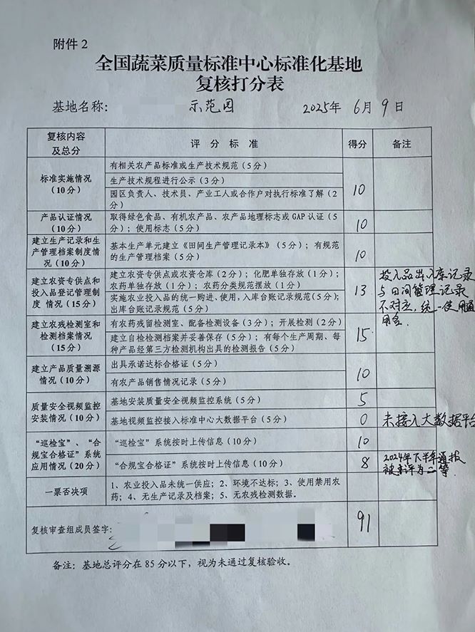 按照年度工作计划,全国蔬菜质量标准中心对2022年度认定的标准化基地,开展了3年期满换证前的现场复核工作。本次复核基地有安丘市长生源生态家庭农场、平度市马家沟芹菜示范园、青岛盛客隆现代农业基地、江苏盐城响水九丰农博园、济南市晋康蔬菜标准园、山东七河生物科技股份有限公司、陕西安康天瑞塬现代农业园等8家单位。复核工作组根据《标准化基地复核办法》,对各基地在标准实施执行、生产过程管理、投入品管控、安全检测落实、产品质量追溯等9大项16个指标进行现场核准、量化打分、综合评价,最终7家基地顺利通过复核检查。