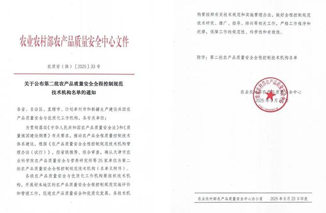 近日,农业农村部农产品质量安全中心公布第二批农产品质量安全全程控制规范技术机构名单,全国蔬菜质量标准中心经省级推荐、部级综合审查成功入选。