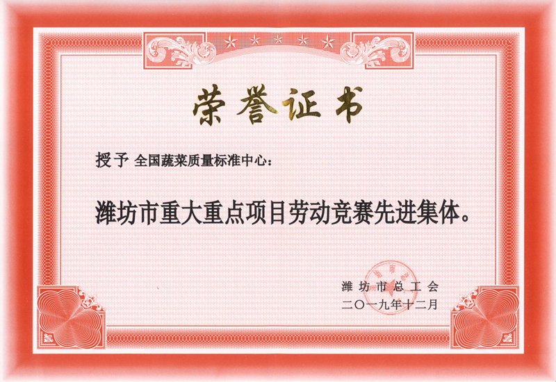 全国蔬菜质量标准中心由农业农村部和山东省人民政府联合建立,2018年7月12日在寿光揭牌成立,公益一类事业单位,正处级规格,内设综合科、信息科、标准科、认证科、推广科、财务科6个科室和国家蔬菜质量标准化创新联盟办公室。中心按照“生产有规程、安全有保障、质量有评价、产品有品牌、价格有导向”的功能定位,围绕制定修订标准、示范推广标准、培训普及标准、蔬菜品质认证和品牌培育等工作重点,全力打造蔬菜全产业链标准集成和研发中心、蔬菜质量安全评估和预警中心、蔬菜品牌培育和品质认证中心、蔬菜信息交流和技术服务中心。